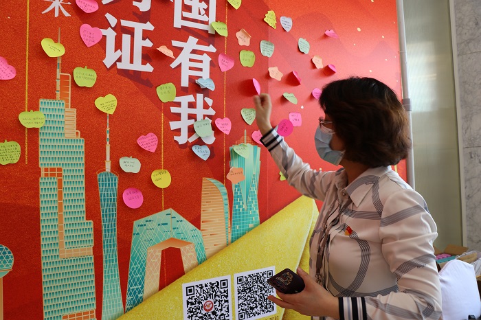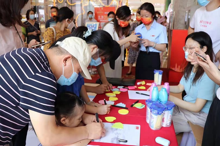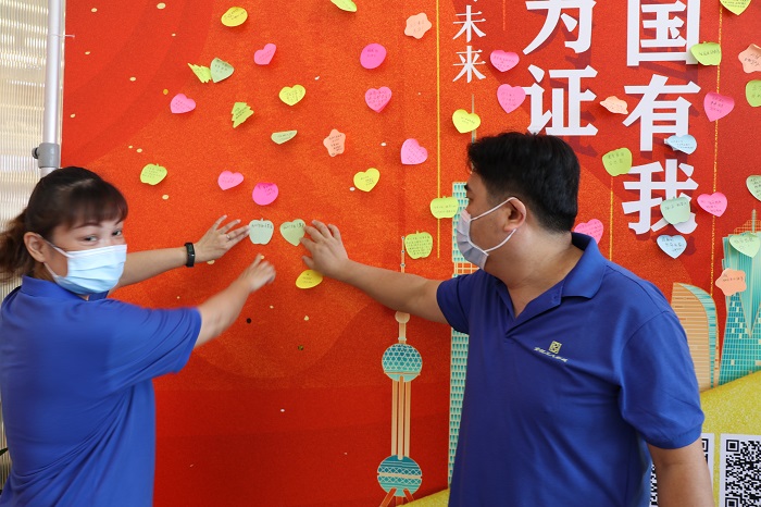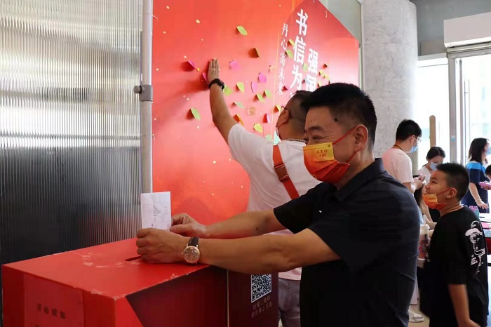 活动现场,来自新百的全国劳模朱爱华郑重写下了自己的寄语“作为一名企业家,见证了民营经济迅猛发展,百姓生活日益提高,我为伟大的祖国感到骄傲。未来,我会带领南京新百全体党员骨干,大力弘扬劳模精神、劳动精神、脚踏实地爱岗敬业,尽职尽责书写新时代劳动者的奋斗之美,为把南京建设成为面向世界的国际消费中心城市,贡献智慧和力量!”“如果爱国只能选择一种颜色,我爱中国红!”今年60岁的上官李军难掩激动地写下祝福话语。提笔交心,见字如唔,很多小朋友在家长的带领下,一笔一划写下对祖国的热爱,也表达对美好未来的期望。