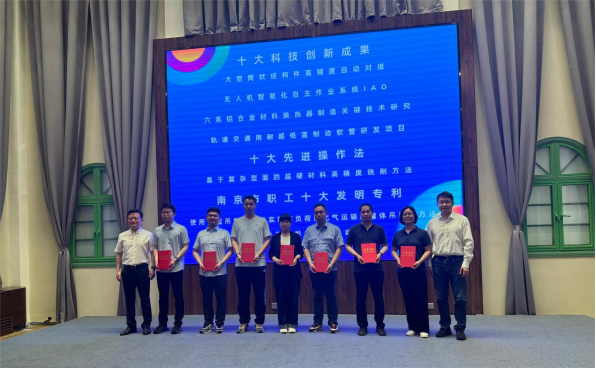 在1865兵工学堂举行的南京市低空经济制造业职工科技创新交流大会上,市总工会郁忠副主席、省机冶石化工会张旭海主任为获得2023年度南京市职工“十大科技创新成果”“十大先进操作法”“十大发明专利”认定的7名职工颁奖,他们手捧“南京市技术能手”荣誉证书熠熠闪光,激励着全场来自一线的百名产业工人。