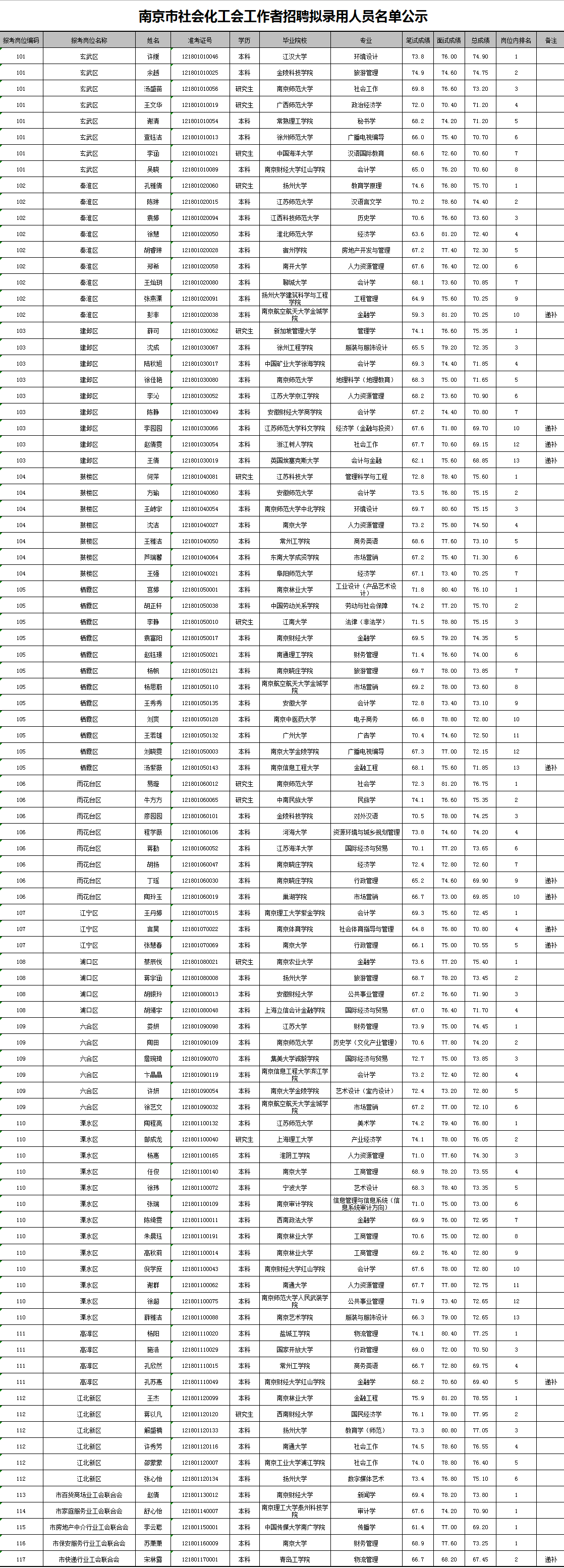 南京市社会化工会工作者招聘拟录用人员名单公示