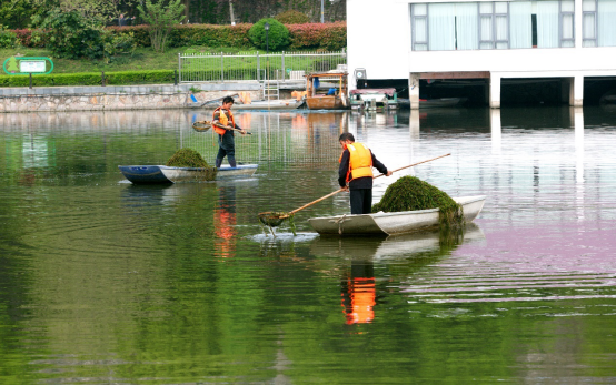 水面环境护卫队。每天早上6:30上班,每人一条小船,分片清理疯长的水草、湖面漂浮物。一年四季,不论吹风下雨还是酷暑严寒,他们常年耕耘在宽阔的月牙湖上,用辛勤的劳动和汗水换得了月牙湖水环境的巨变。