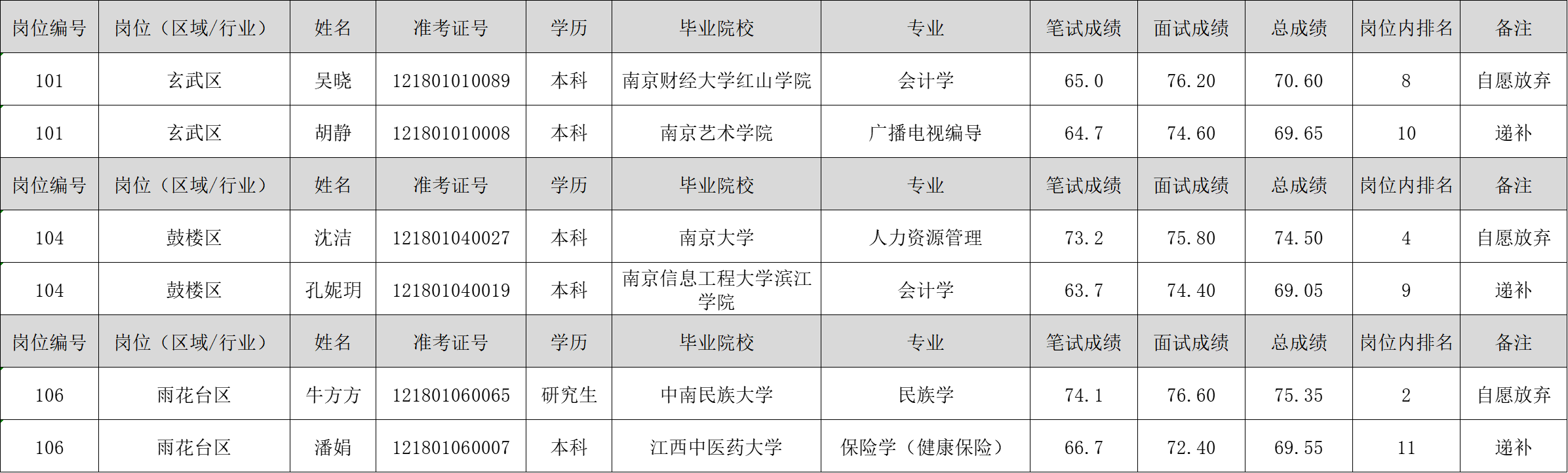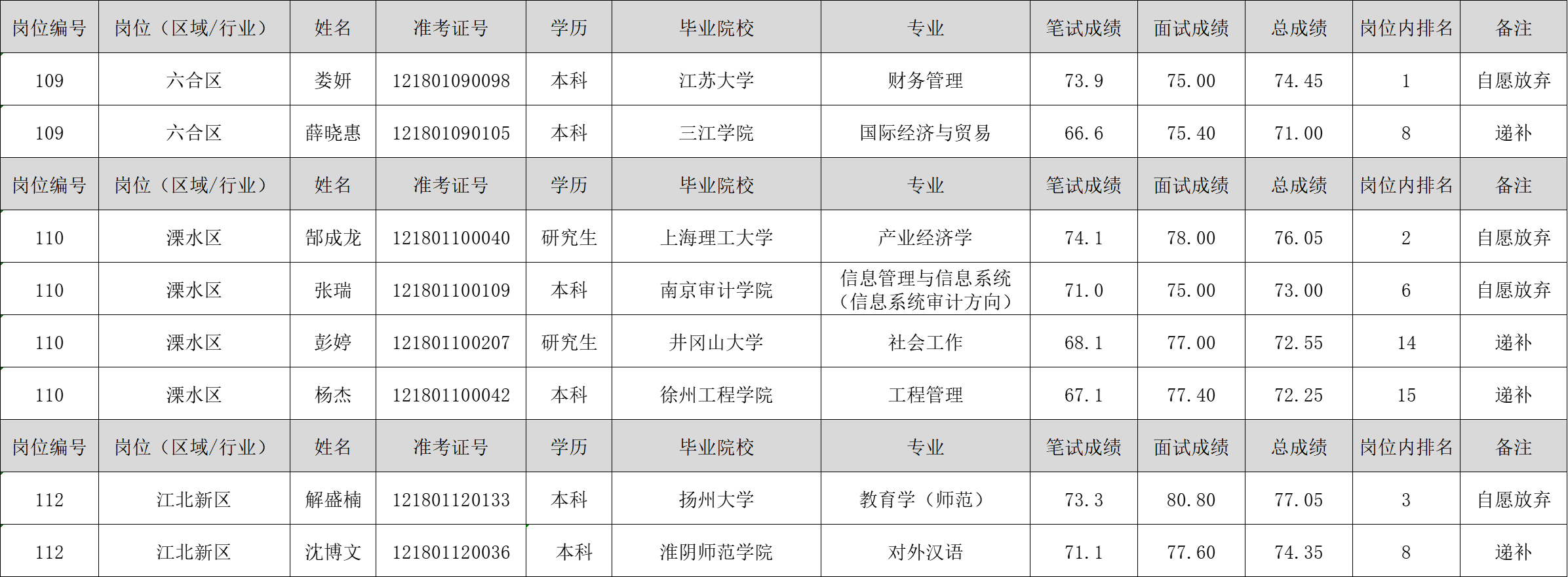 南京市社会化工会工作者招聘拟录用人员名单已于2023年2月10日进行公示,公示后有部分考生自愿放弃录用资格,根据招聘公告有关规定,在报考同岗位的考生中按总成绩从高分到低分的顺序递补,递补人员经体检、考察等程序,现将南京市社会化工会工作者招聘放弃及拟录用递补人员名单予以公示: